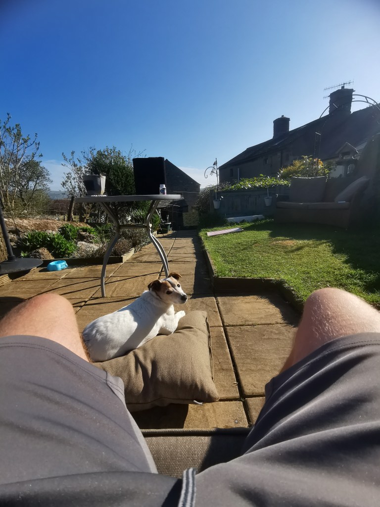 Chilled afternoon in garden ready for 6pm bodyweight HiiT blast ☀️💦